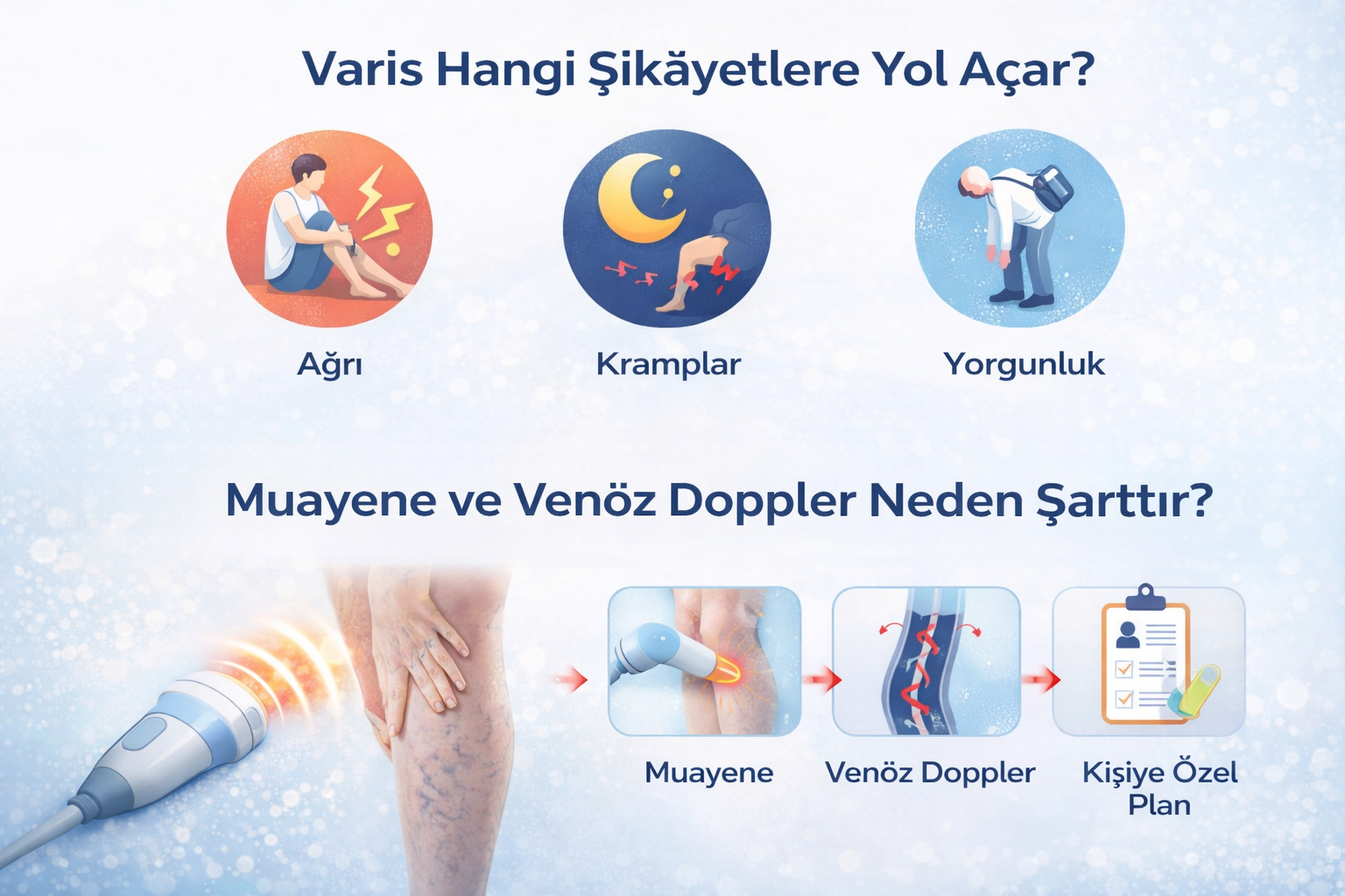 Bacaklarda görülen varisler yalnızca estetik bir sorun değildir. Özellikle gün içinde ayakta durdukça artan ağrı, gece krampları, bacaklarda ağırlık ve yorgunluk hissi varsa, bu durum altta yatan bir toplardamar yetmezliğinin işareti olabilir.